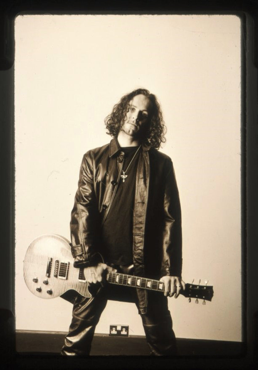 Colour portrait of Viv with a Gibson Les Paul Standard, circa 1996. Photo: Cynthia Levine. From the Collection of Def Leppard.