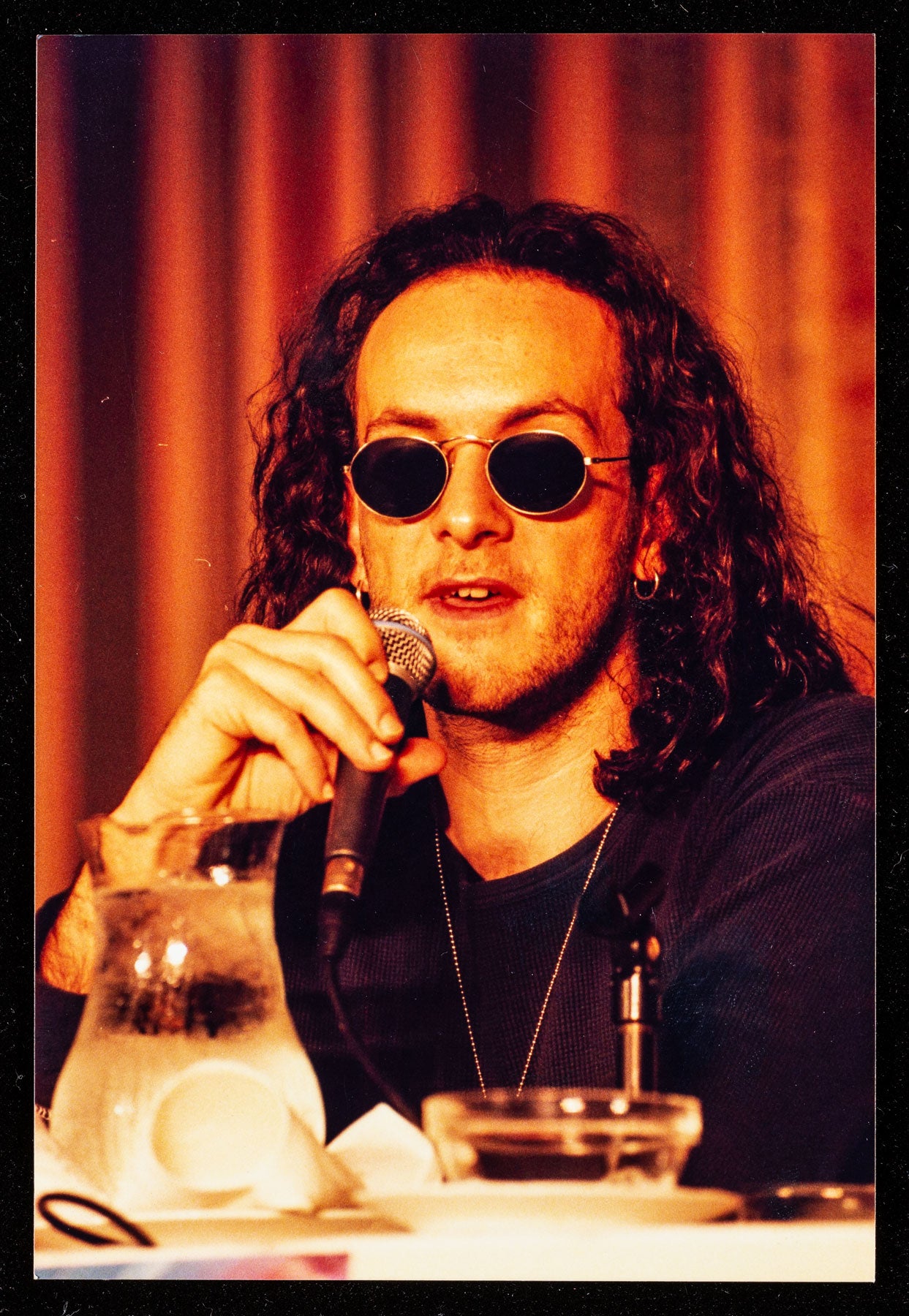 Viv participates in a press conference in support of the band's performance at The Capitol Radio Coca-Cola Music Festival, London, June 1992. Photo: Ross Halfin. From the Collection of Def Leppard.
