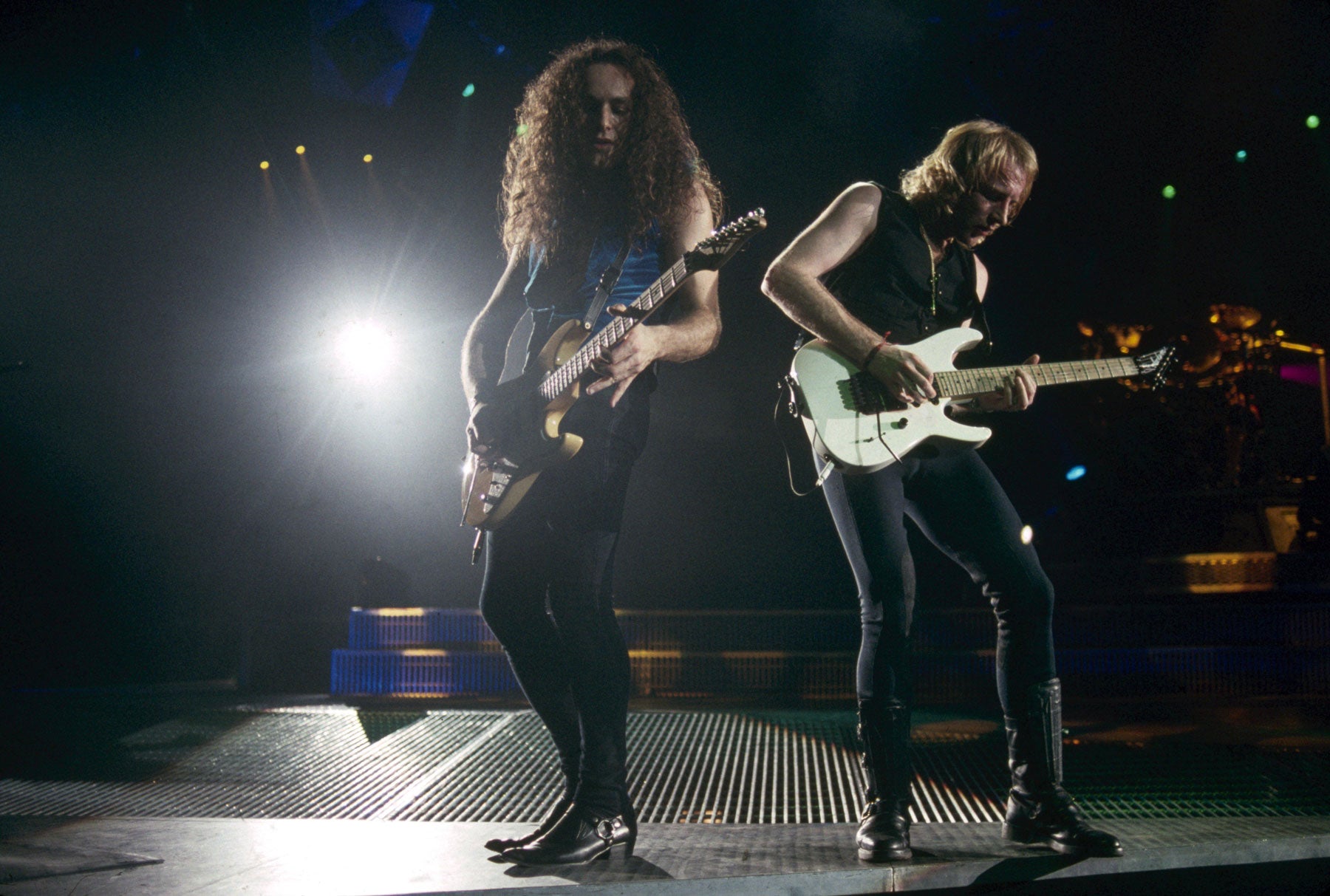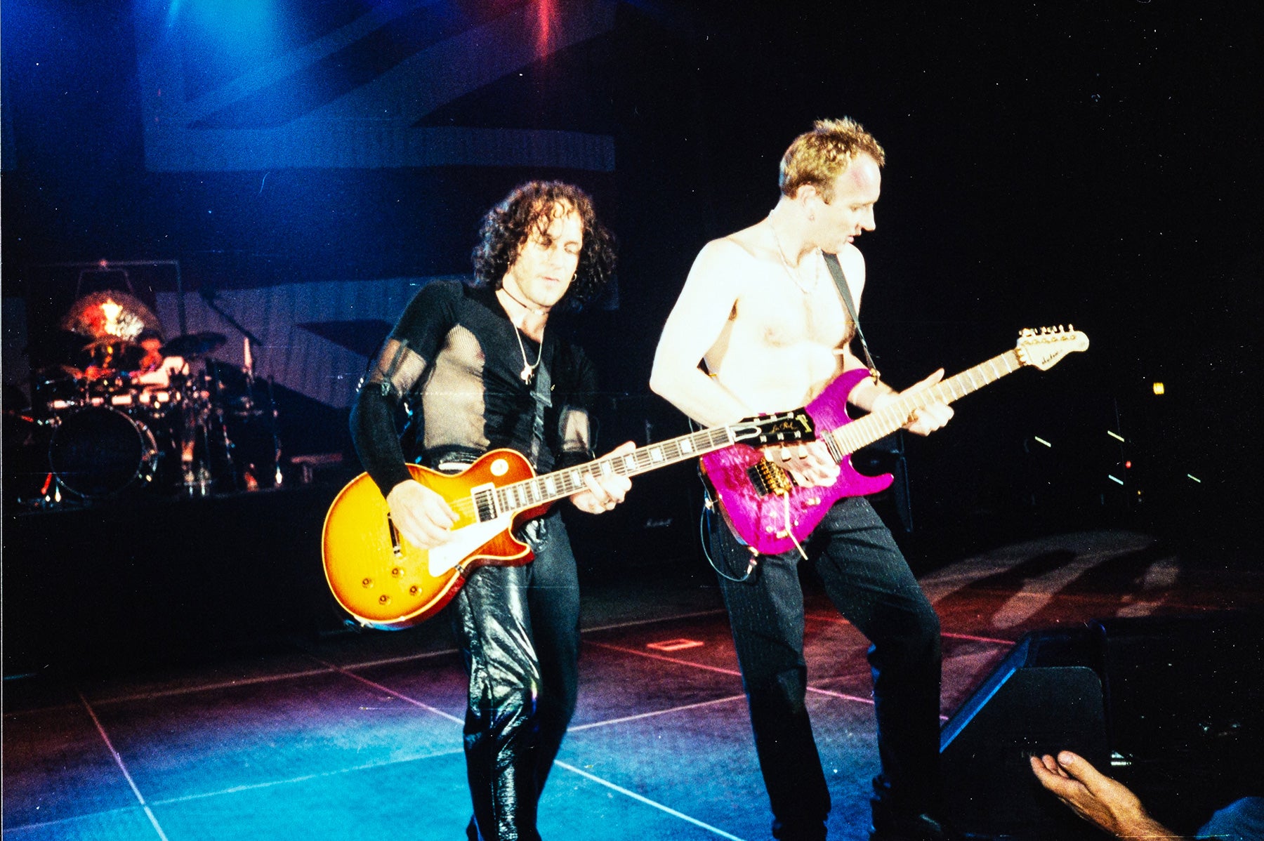 Viv and Phil provide dual guitar action on the Euphoria Tour, Colorado State Fair Events Center, Pueblo, Colorado, 6 September 1999. From the Collection of Joe Elliott.