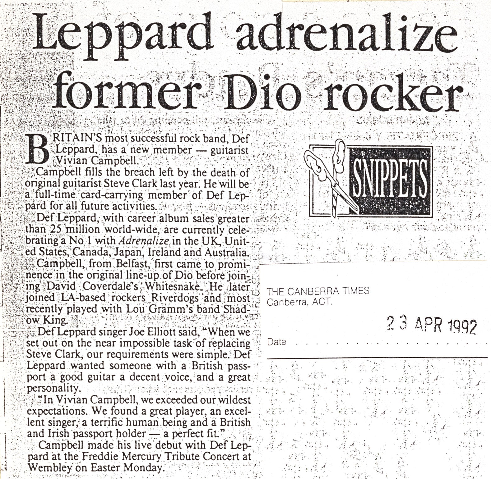 Article from Australia's The Canberra Times, 23 April 1992, announcing Viv joining Def Leppard. Joe is quoted: "In Vivian Campbell, we exceeded our wildest expectations. We found a great player, an excellent singer, a terrific human being, and a British and Irish passport holder. A perfect fit." From the Collection of Joe Elliott.