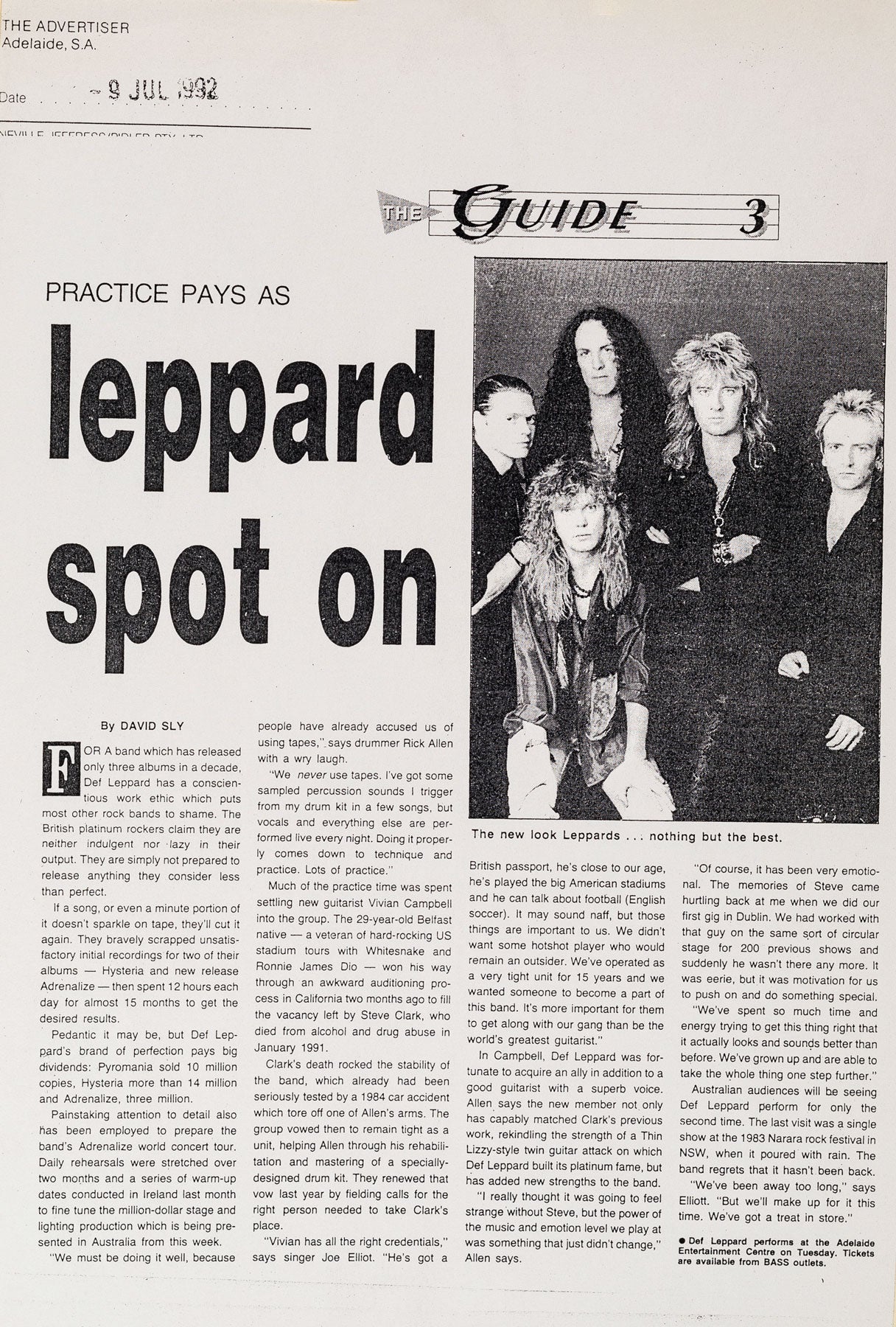 Clipping from Adelaide's The Advertiser, 9 July 1992, that details Viv joining Def Leppard as a rare match for the band's extraordinary work ethic and proficiency. From the Collection of Joe Elliott.