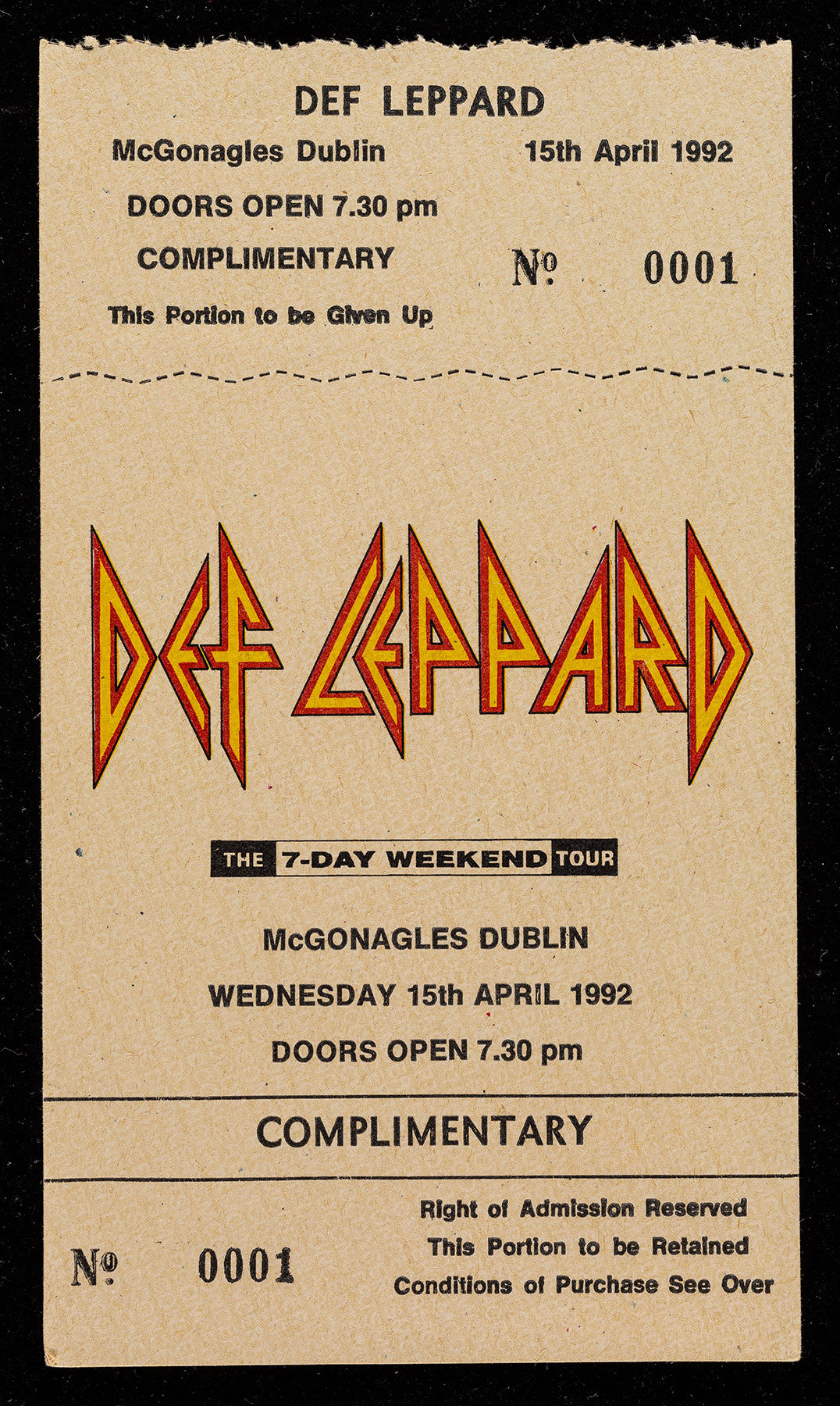 Ticket (numbered 0001) for Viv's first performance with Def Leppard, McGonagles, Dublin, Ireland, 15 April 1992. The show gave the band an opportunity to officially welcome Viv to the Def Leppard family, as well as warm-up for the televised Freddie Mercury tribute a few days later. From the Collection of Joe Elliott.