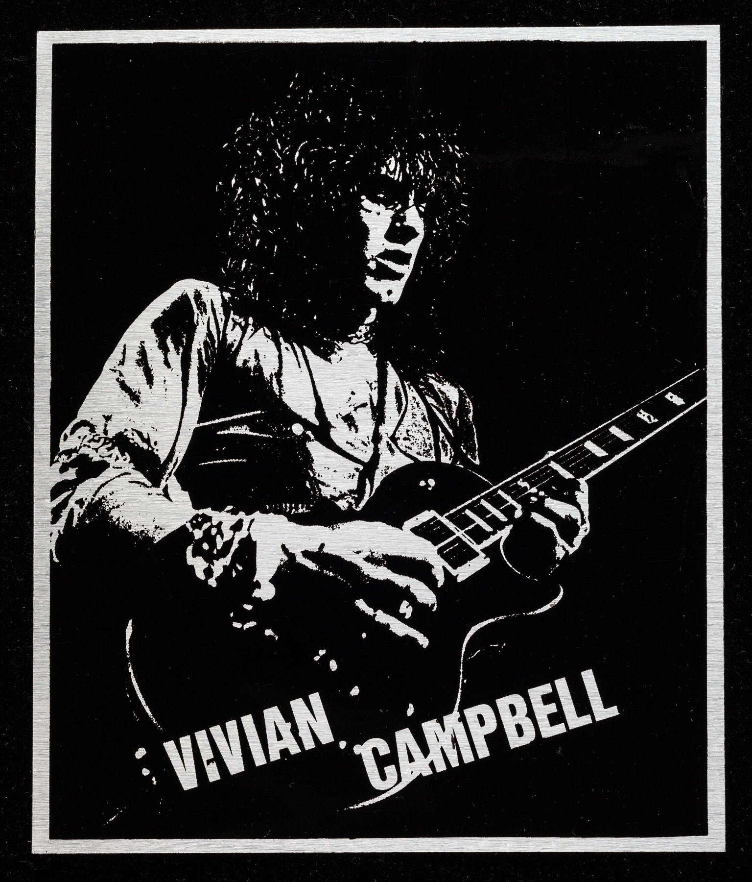 Viv's limited-edition model Gibson Vivian Campbell Signature Les Paul Custom with an antrim basalt black burst finish. Viv explains the brushed chrome look of the guitar: "I never liked shiny guitars. I've always appreciated a patina...a guitar that tells a story." Photo: John Zocco. From the Collection of Vivian Campbell.