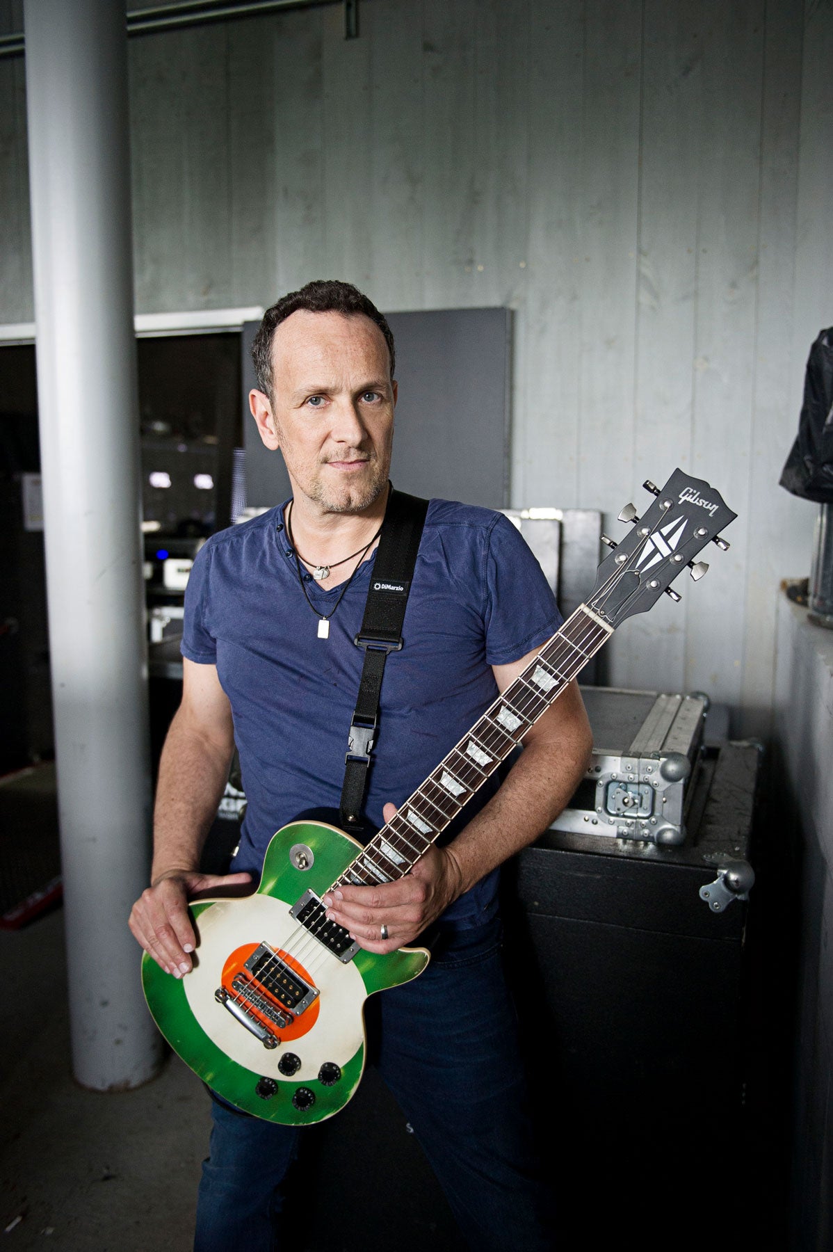 Viv poses with his guitar "Quadrofenian". Put together by GMP Guitars, it boasts the three colours of the Irish flag. Photo: Ross Halfin. From the Collection of Def Leppard.