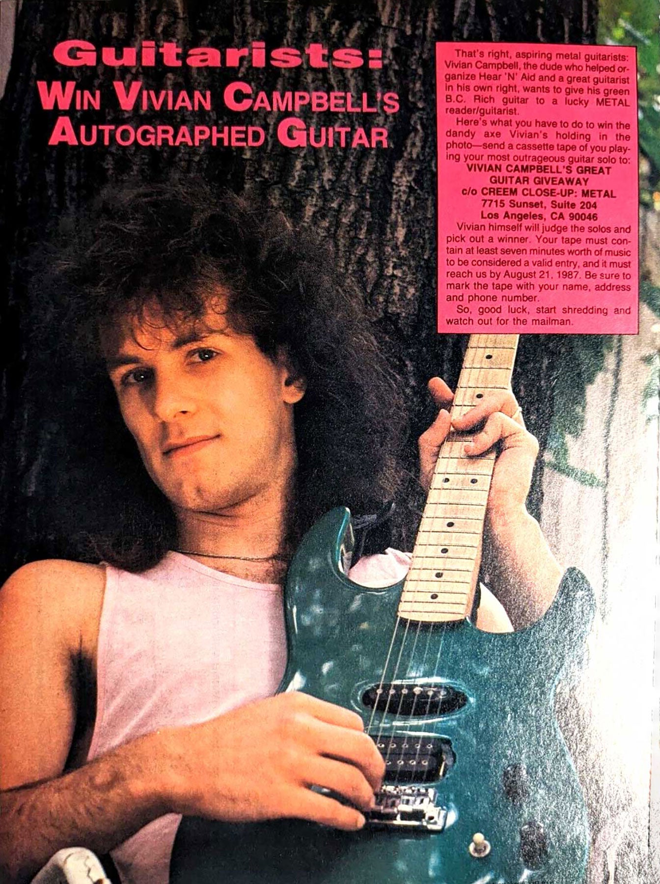 Giveaway notice clipped from Metal magazine, 1987. Viv (then in his Whitesnake era) judged submissions of guitar solos to win a green B.C. Rich. From the Collection of Def Leppard.