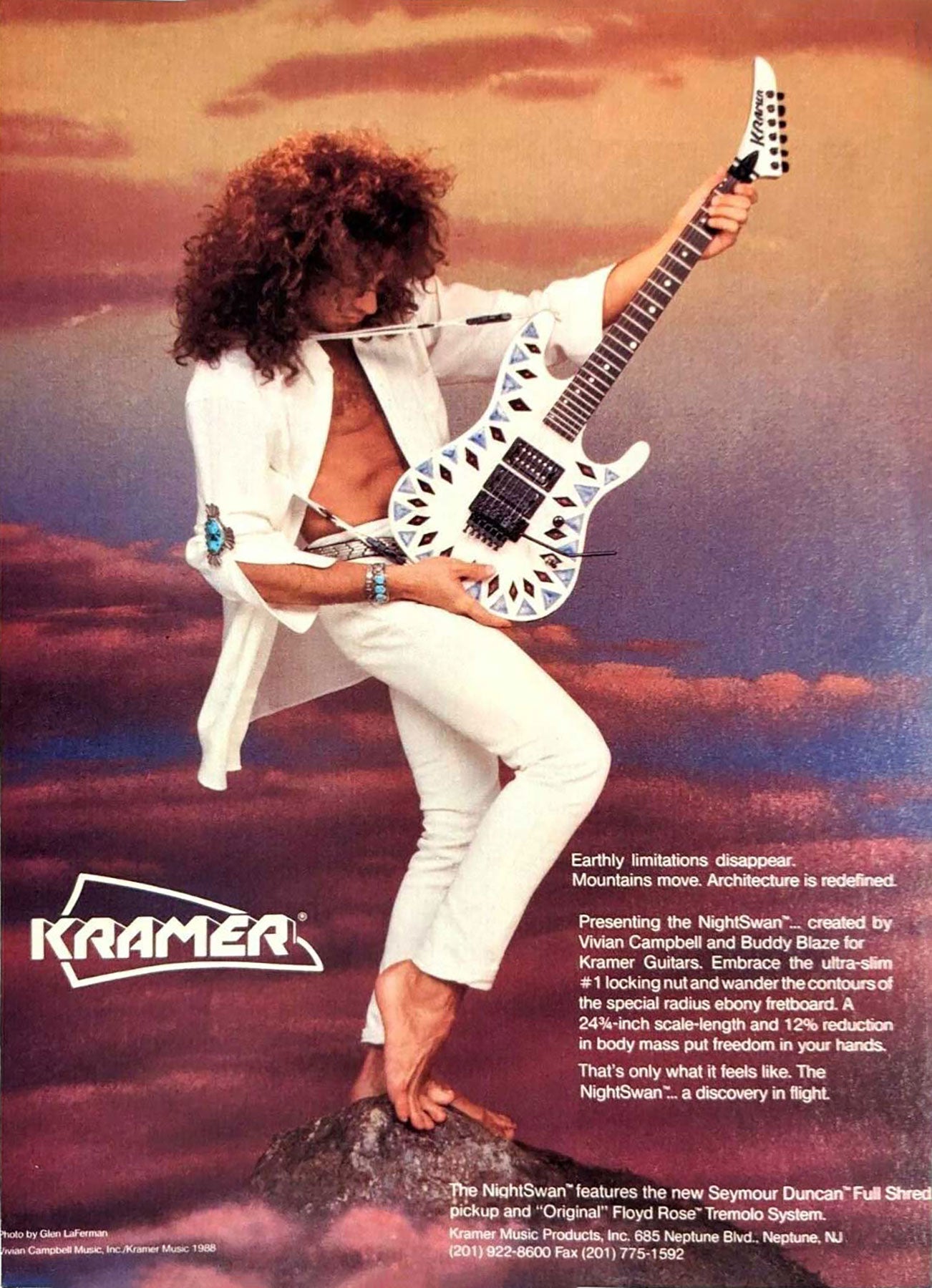 Advert for the NightSwan guitar created by Vivian Campbell and Buddy Blaze for Kramer, 1988. Photo: Glen LaFerman. From the Collection of Def Leppard.